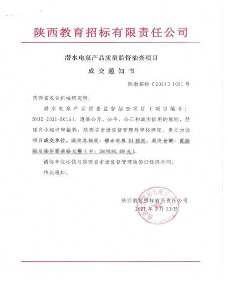 陜西省農(nóng)機(jī)質(zhì)檢總站成功中標(biāo)2021年潛水電泵質(zhì)量監(jiān)督抽查項(xiàng)目